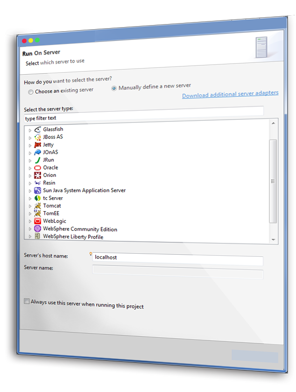 部署的应用服务器包括WebSphere、Glassfish、WebLogic和Tomcat等等。为了应对极速测试,提供了即时可用的集成化MyEclipse Tomcat和Derby服务器。