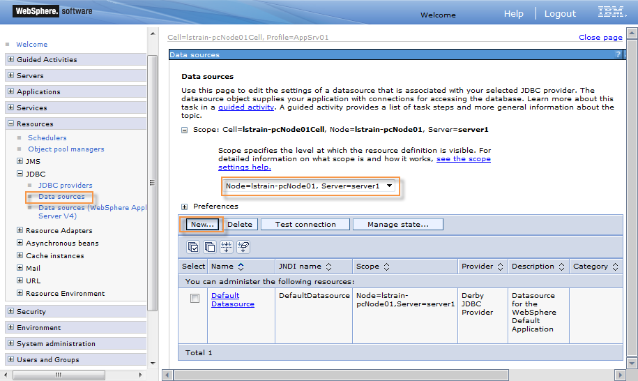 1. 在左边的菜单中,展开Resources>JDBC并选择数据源。