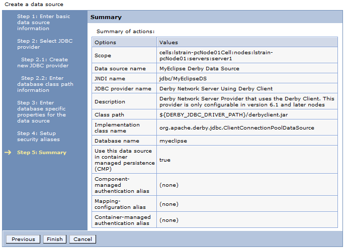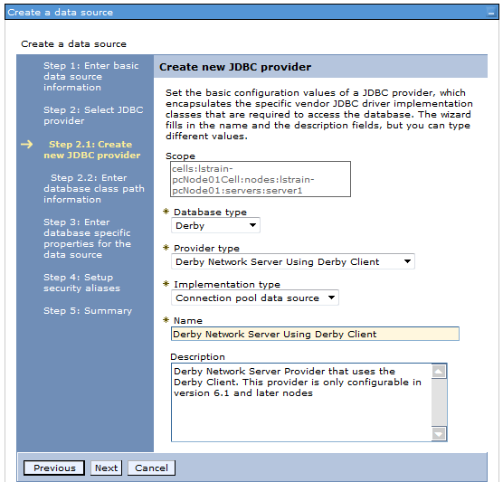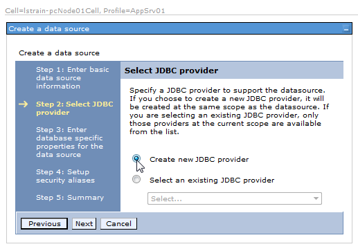 注意:您可以创建一个JDBC Provider,然后建立一个数据源映射到JDBC Provider上作为单独的步骤。在本教程中,您在一个单一的向导中创建。