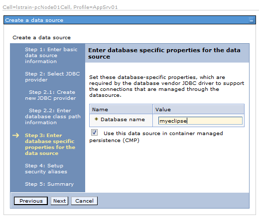 4.在WebSphere向导中数据库名称字段类型是MyEclipse,然后点击下一步。