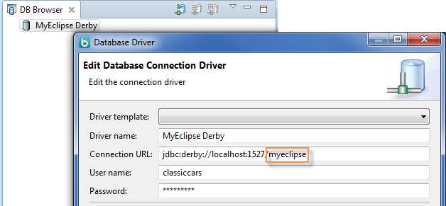 右键单击MyEclipse Derby数据库,并从菜单中选择编辑。数据库名是MyEclipse,在末尾附加连接的URL。