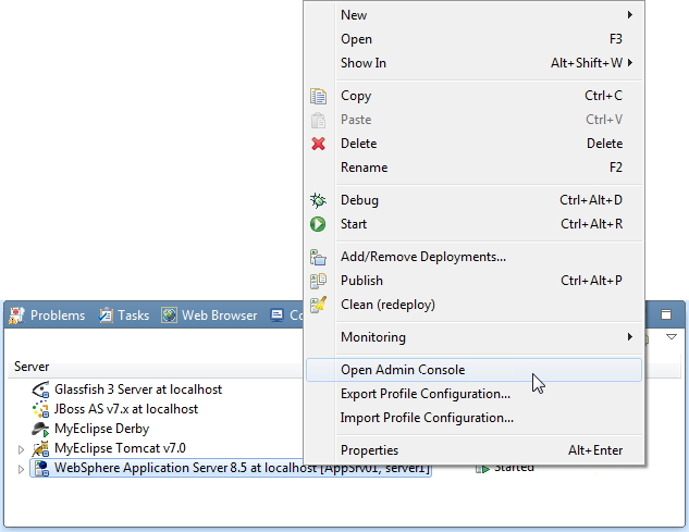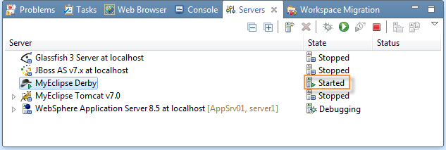 1. 在MyEclipse中,在服务器视图中右键单击该MyEclipse Derby服务器,并选择运行服务器。如果服务器没有运行,则它会拒绝来自WebSphere的输入连接。