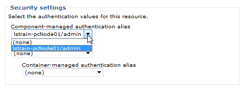 6. 请找到安全设置部分,然后从组件管理认证别名的下拉列表中选择您刚刚创建的用户身份,然后单击确定。