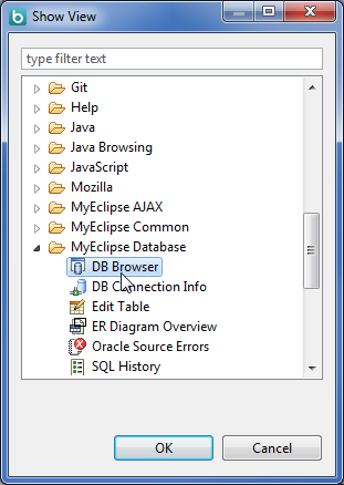 在MyEclipse中,通过从菜单中选择Window>Show View>Other来打开DB浏览器。在Show View窗口中,展开MyEclipse数据库,然后单击DB浏览器。