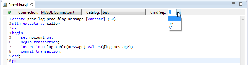 您可以通过使用SQL编辑器的Cmd Sep下拉列表来改变命令分隔符。从分离器的现有设置选择,或输入您自己的类型。