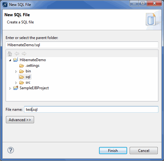 (2)在项目文件夹中选择您想要保存的新的SQL文件和文件名,然后单击Finish。
