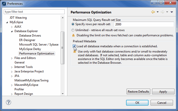 (1)选择Window>Preferences,展开MyEclipse>Database Explorer,并选择Performance Optimization。