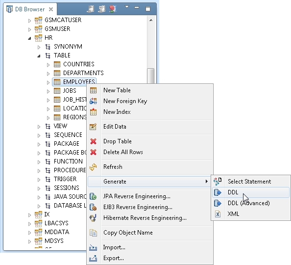 要生成现有表的数据定义语言(DDL),右键单击表中的数据库浏览器并选择Generate>DDL。