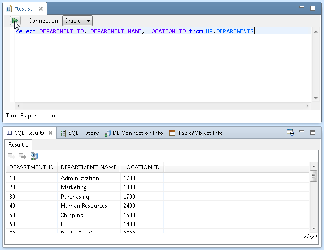 通过单击或按CTRL+ F9来执行所选中的SQL语句片段。在这种情况下,如果没有选中SQL语句,如下面的示例所示,则SQL编辑器执行整个编辑文本。最后的查询结果显示在SQL的结果视图中。