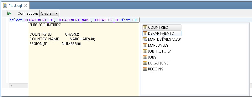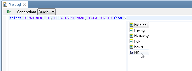 现在您可以输入SQL语句,在每一部分的SQL片段中利用代码辅助(Ctrl +空格键),如下图所示。