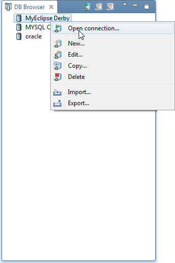 3. 在DB浏览器中,右键单击MyEclipse Derby驱动程序,然后选择打开连接。
