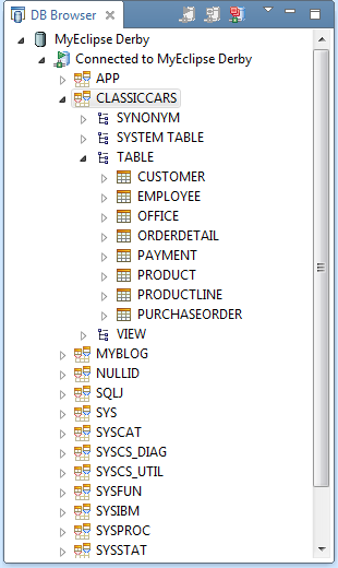 MyEclipse Derby附带了一个示例数据库命名为myeclipse。该数据库包含两个示例模式,CLASSICCARS和MYBLOG。其他模式是可见的Derby的系统架构。