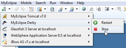 要停止Derby,点击下拉箭头,选择MyEclipse Derby>停止。