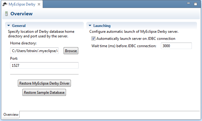 主目录:这是在Derby中存储数据库的位置,使用您的数据库名称在指定的位置创建文件夹。在默认的情况下,主文件夹设置为/.myeclipse/derby