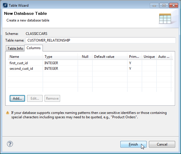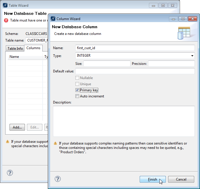 (4)在Name字段的first_cust_id类型中,从下拉的类型列表中选择INTEGER,选择主键复选框,然后单击Finish。