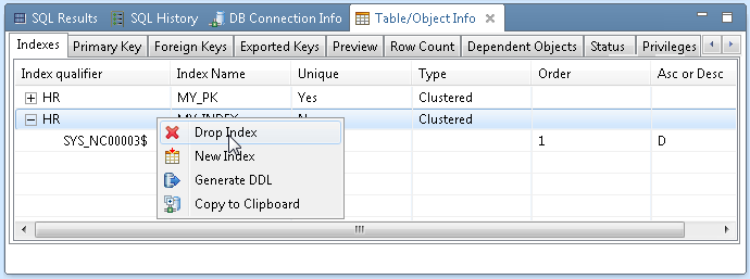 3. 右键单击要删除的索引,并选择DROP INDEX。