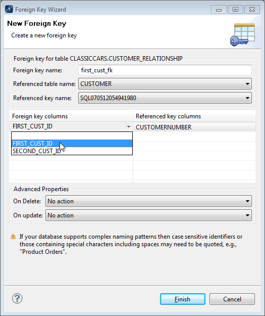 (3)单击外键列中的第一个单元格,单击下拉箭头,选择first_cust_id,然后单击Finish。