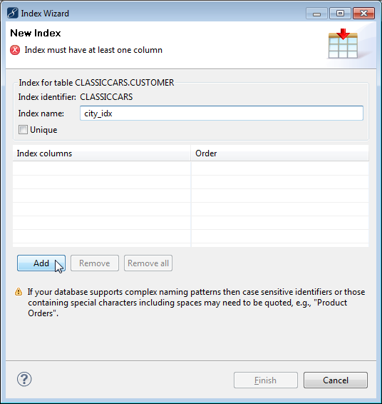 (3)在索引名称字段类型中输入city_idx,并单击Add按钮来将此新的索引添加到其所属的列中。