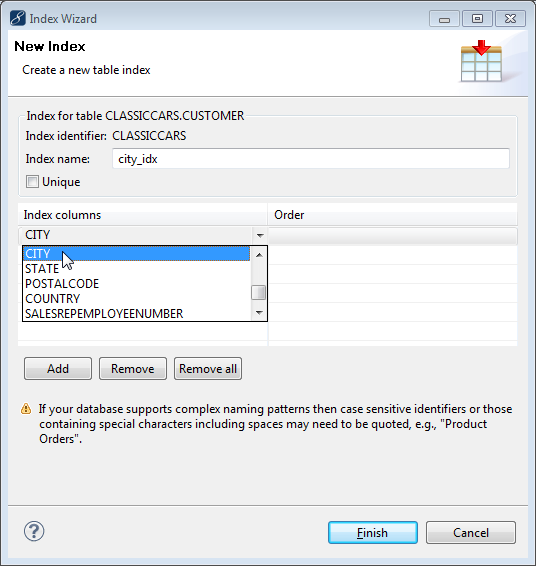(4)在索引列表中单击第一个单元格,单击下拉箭头,选择CITY,然后单击Finish。