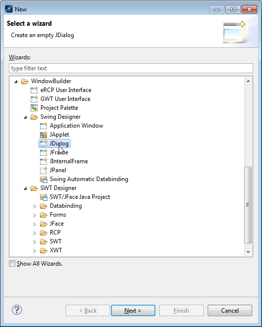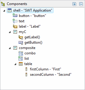 使用SWT/ Swing设计器为项目的一部分创建一个新的UI元素类。选择File>New>Other,然后展开WindowBuilder并在众多组件中选择一个,通过向导继续完成元素的细节。