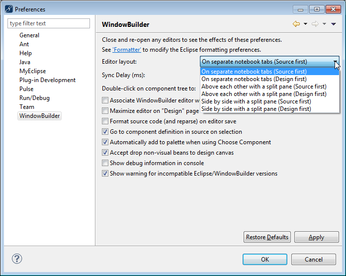 通过选择Window>Preferences,然后选择WindowBuilder可以访问编辑器布局参数。