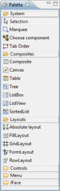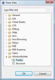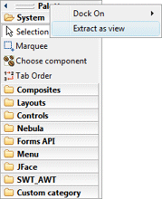 该面板也可以作为一个独立的视图。选择Window>Show View>Other,展开WindowBuilder,然后选择面板或右键单击面板并选择解压视图。关闭待机面板视图将返回默认的位置,并内置在编辑器中。