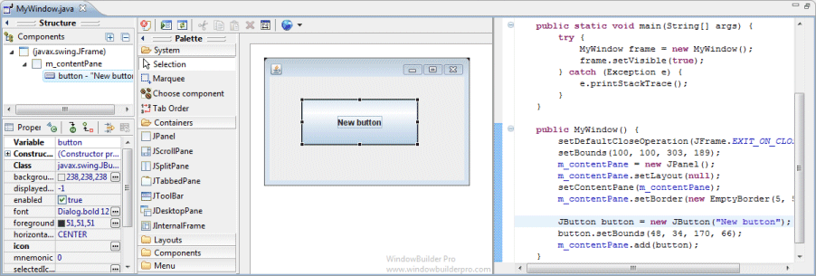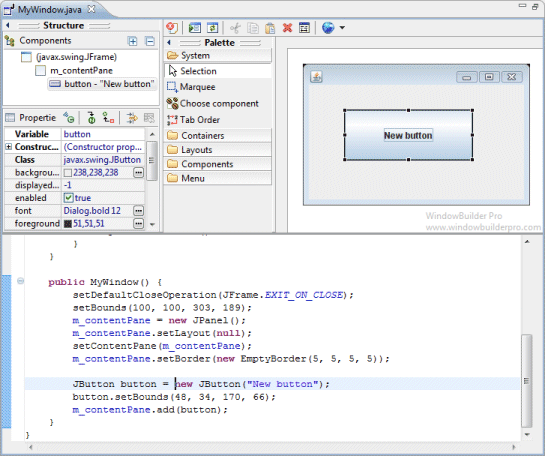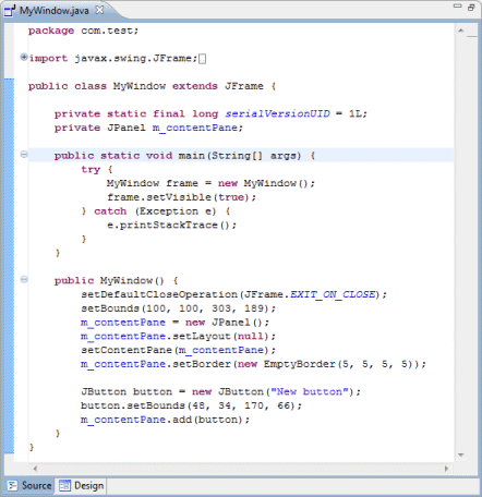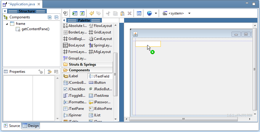 在您完成向导并创建完成UI元素之后,Swing设计器打开并允许您在设计元素时使用设计视图或源视图。