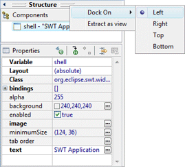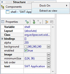 结构视图也可以作为一个独立的图。选择Window>Show View>Other,展开WindowBuilder然后选择Structure,或者右键单击结构视图,然后选择解压视图。关闭待机的结构视图将返回默认的位置,并内置在编辑器中。