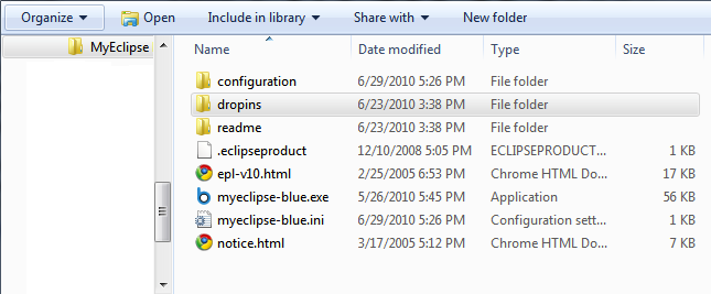 dropins文件夹在MyEclipse的外部使用,所以首先必须将MyEclipse关闭(如果正在运行),然后打开文件浏览器,MyEclipse文件夹中的dropins文件夹下,如图所示。该dropins文件夹应该完全是空的。