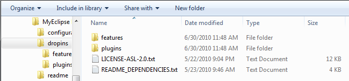 解压文件之后,文件夹树应该类似于下面的图片。可以肯定的是当你启动MyEclipse时dropins文件夹下的features和plugins文件夹对于子插件将会不认可。