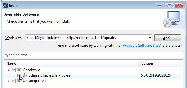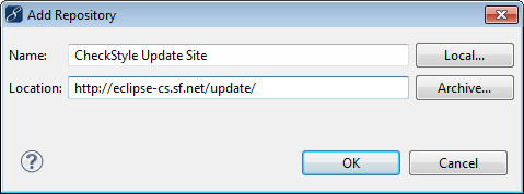 当点击Add按钮时,你可以配置更新站点的位置并提供一个描述。注意,该窗口配置是针对于你访问使用的URL,因为这种类型的网站最常使用的就是远程更新 站点。如果在你的计算机上有一个本地更新站点或有一个zip压缩文件的归档更新站点,那么可以单击本地或存档按钮,而不用输入名称或URL。然而在这个例 子中,我们使用了公共的CheckStyle更新站点,所以我们在它下面填写了URL说明。