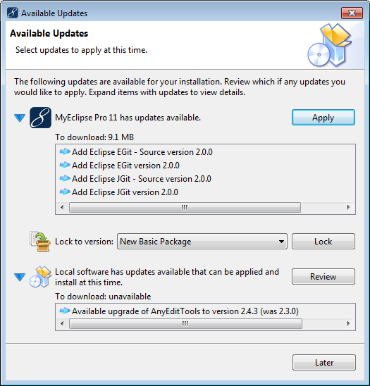 安装更新MyEclipse的组件或外部插件,从菜单中选择帮助>检查更新。因此你可以看到MyEclipse或者任何已安装插件的可用更新,不仅如此,你还能选择锁定到一个特定的MyEclipse版本。