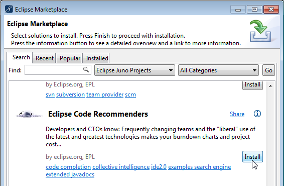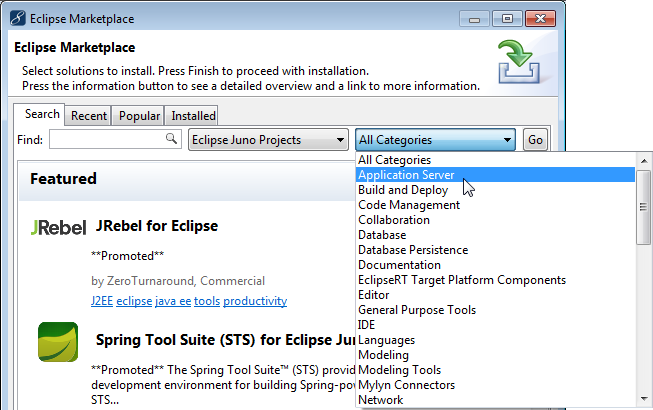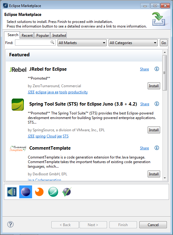 如果你知道插件名称并想添加此插件,可以在搜索区域输入名称后按Enter键。然而在本节中我们假设你并不知道确切的插件名称,而是通过浏览目录来寻找想 要的插件。你可以从下拉列表中选择想要的市场类别来浏览工具的类型,同时还可以浏览最近流行的安装工具并点击相应的选项卡。