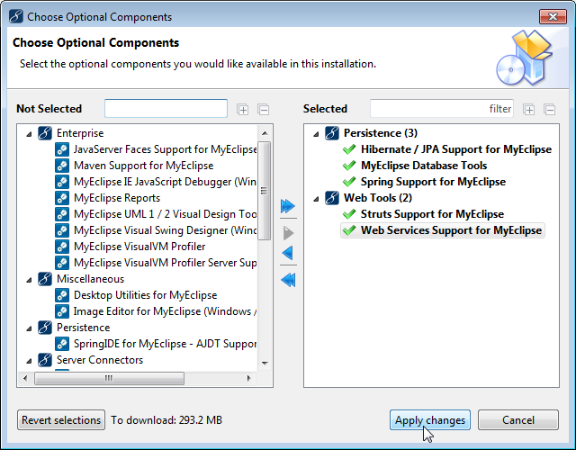 配置重新启动后,在示例场景中的功能支持都包含开发技术的选择。如果在未来开发场景中需要有任何变化,都可以根据你的需求自定义安装MyEclipse。