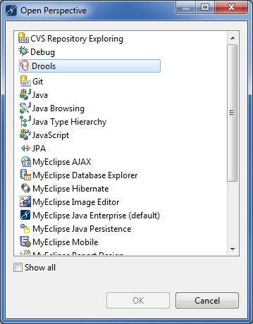 现在,你已经成功的通过dropins机制安装新的插件,可以立即开始使用MyEclipse。在这个例子中,你可以在MyEclipse的视角列表中看到Drools。