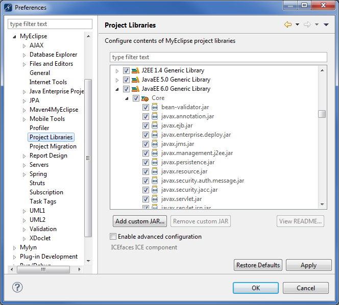 Eclipse的 JDT模型包括类路径容器的概念。类路径容器是Java库的逻辑集合,即在项目类路径中出现的JAR和ZIP文件。 MyEclipse中向用户提供了许多可配置的类路径容器,包括通用的JavaEE库和许多框架库,像JSF、JPA、Spring、Struts等等。