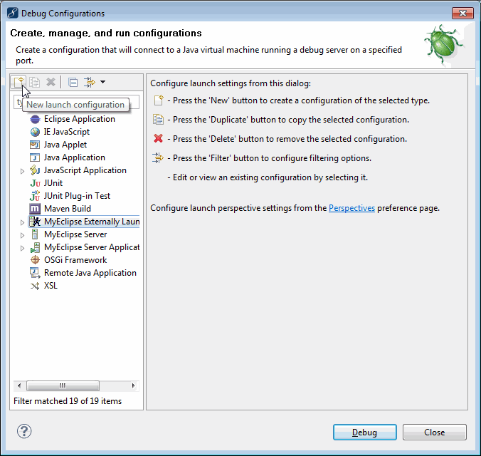 打开调试配置窗口,选择MyEclipse外部启动服务器,然后单击新建启动配置图标,创建用于连接到应用服务器的调试启动配置。