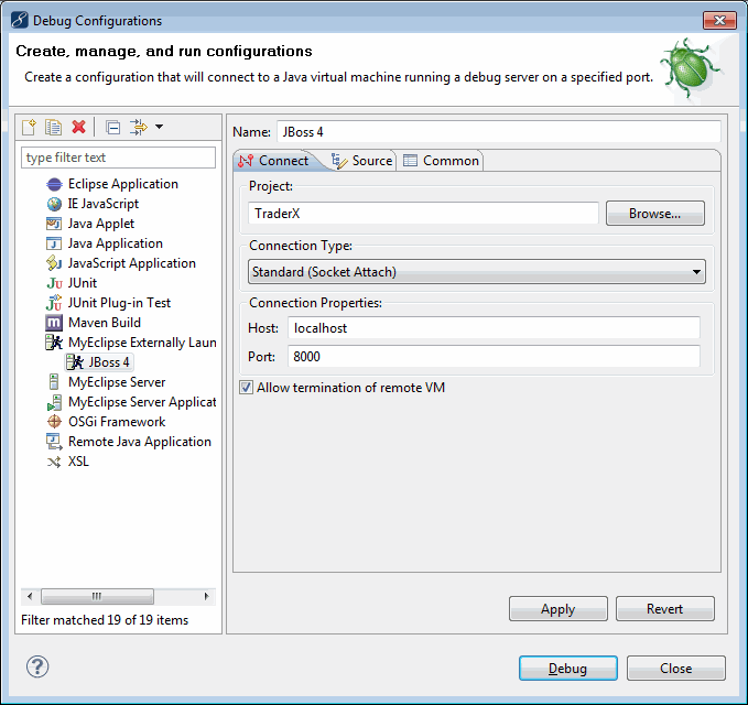 下图显示了一个JBoss 4的远程调试配置示例,任何服务器的设置类似。