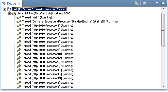 在配置了新的启动配置后,如果你的远程服务器已经运行并监听调试连接,你可以关闭它以后使用单击"调试"按钮。应用程序服务器和外部调试配置被启动后,一个新的调试进程将在调试视图中显示。