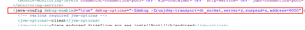 根据你的操作系统平台,调用一个名为asadmin.bat或asadmin.sh的脚本,用来在命令行中启动Sun Java系统应用服务器第8版本实例。如果你的服务器域名启动后,名为domain.xml的配置文件将被读取。domain.xml中包含可以手动设置 启动远程调试的其他JVM启动选项,编辑domain.xml文件,如下图所示,然后启动服务器并以管理员命令启动远程调试。