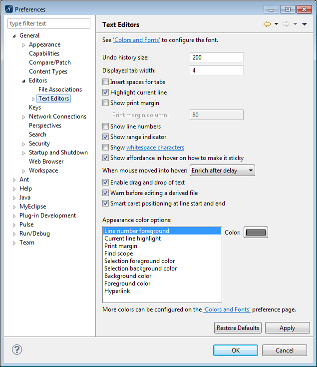 右键单击编辑器并从菜单中选择文本编辑器的Preferences。此外,你还可以从主菜单中选择Window>Preferences,展开常规>编辑器并选择文本编辑器来找到它们。