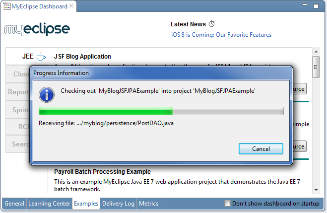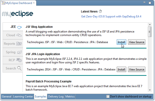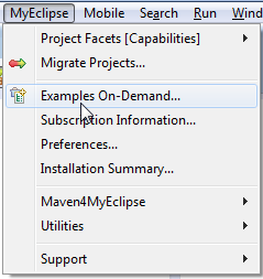 MyEclipse中提供了一个集成示例点播浏览器。这些示例点播浏览器是富互联网应用程序(RIA)技术的创新应用,使你能够无缝地浏览网上的应用示例,然后直接从MyEclipse的工作台中迅速地下载,并在几秒钟之内安装和运行这些示例资源。