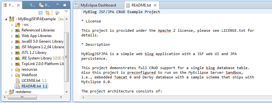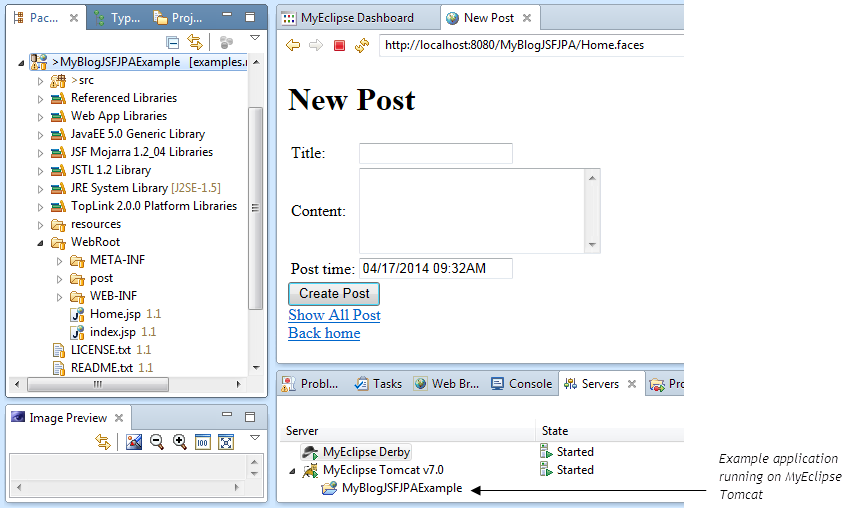 注意:如果你正在运行的应用程序需要一个数据库连接,不要忘记运行示例应用程序之前启动MyEclipse Derby,否则当你的应用程序试图访问数据库时不能连接,可能得到一个ConnectionException。