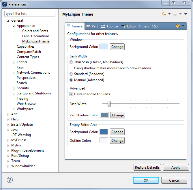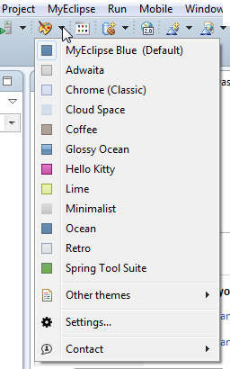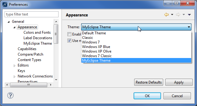 您可以为您的MyEclipse的工作台设置喜欢的颜色。从菜单中选择Window>Preferences,将其展开并选择外观,您可以选择颜色的主题列表。