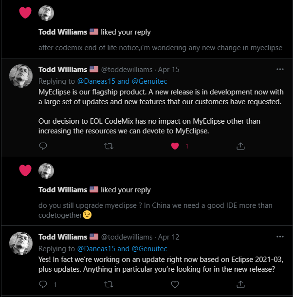 近期,Myeclipse团队在Tweeter上公布了CodeTogether4.0版本(结对编程工具),借此机会小编也向官方求证Myeclipse更新进度。